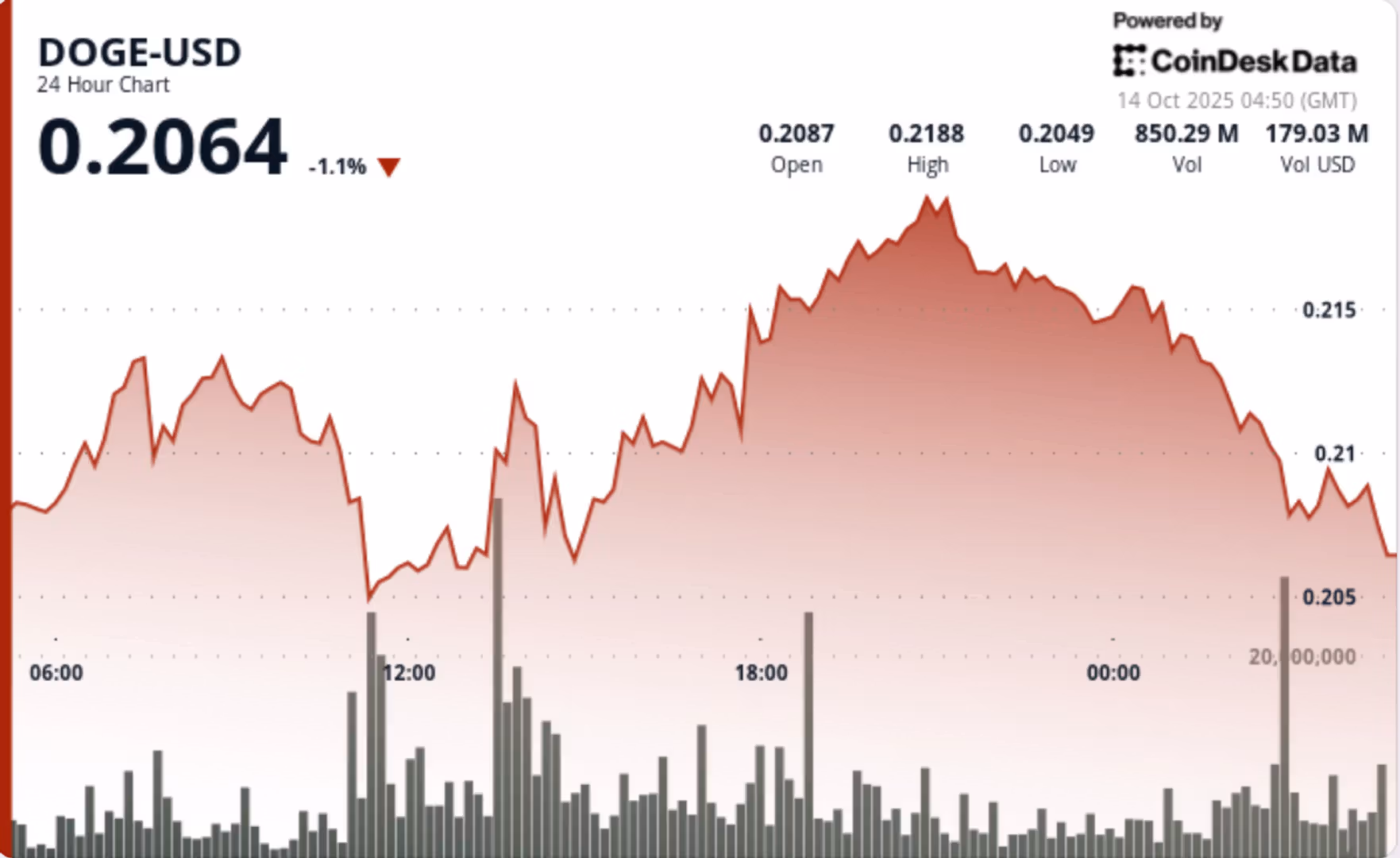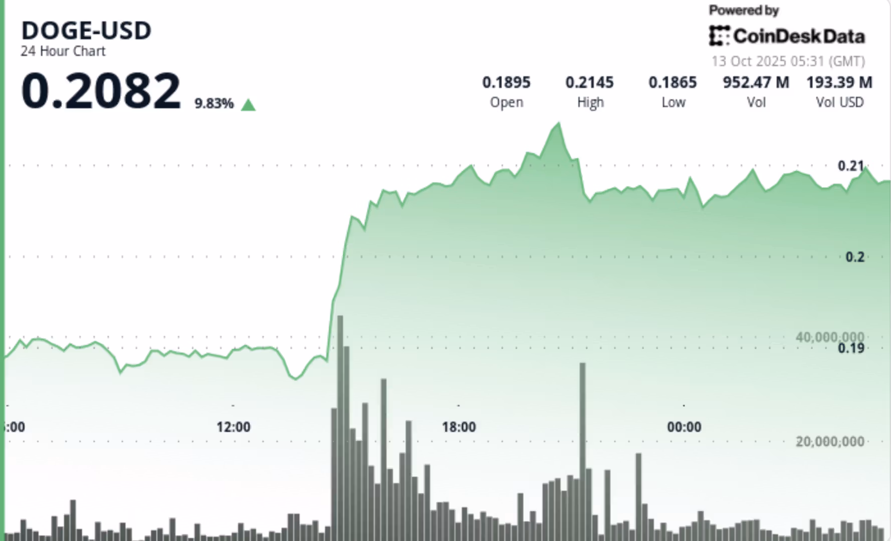 Dogecoin experienced a 50% flash crash on Oct 10, dropping from $0.22 to $0.11 before recovering to the $0.19–$0.20 range.