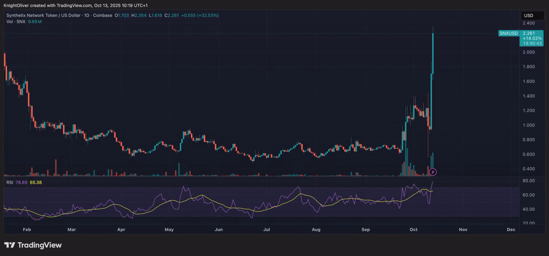 SNX surged 93% in the past 24 hours, reaching a nine-month high of $1.87.