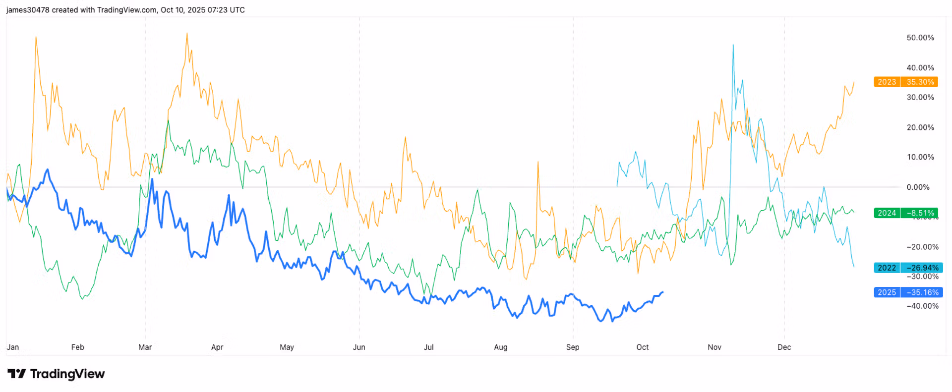 Bitcoin's implied volatility (IV) has reached a 2.5-month high, consistent with seasonal trends.