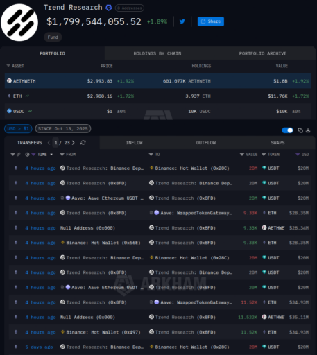 Trend Research has a long spot position on Ethereum valued at approximately $1 billion.