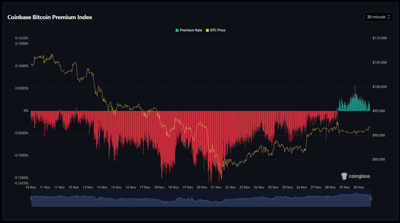 - The Bitcoin Coinbase premium turned positive at 0.0255% after 29 days, indicating potential increasing buying interest in the US.