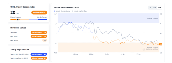 - The CMC Altcoin Season Index is at 20, indicating a Bitcoin-favored phase and weak broader sentiment.