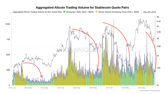 - CryptoQuant analysis suggests a favorable accumulation window for altcoins as trading volumes dip below the yearly average.