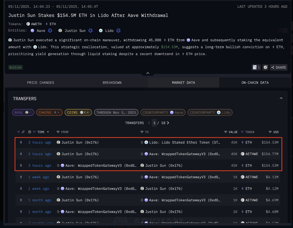 Crypto entrepreneur and Tron founder Justin Sun moved approximately 45,000 Ethereum (worth around $154.5 million) from Aave to Lido Finance's staking pool.