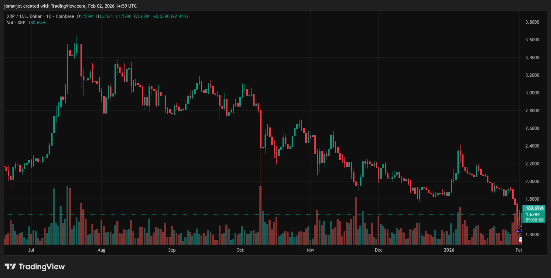 - XRP is trading around $1.6, positioned on a key weekly support band.
