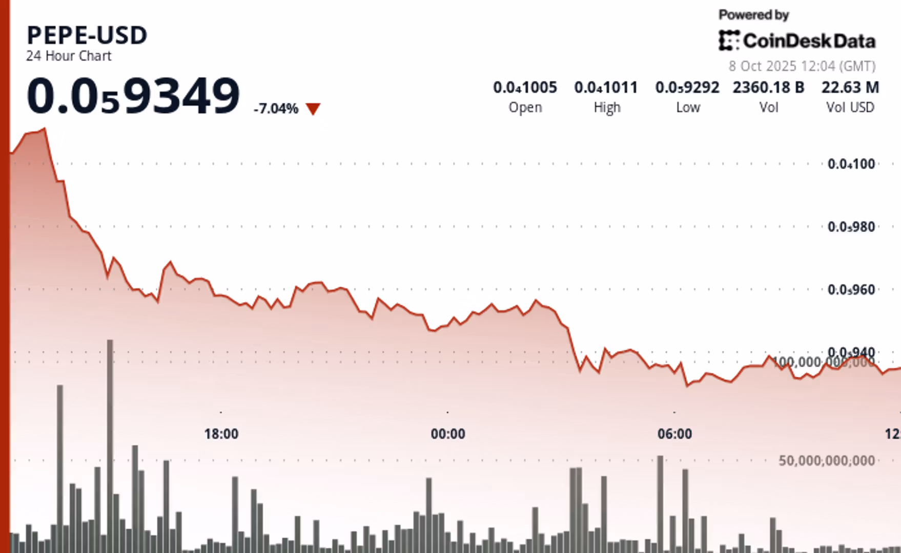 PEPE снизился почти на 4% за 24 часа на фоне распродаж на рынке.