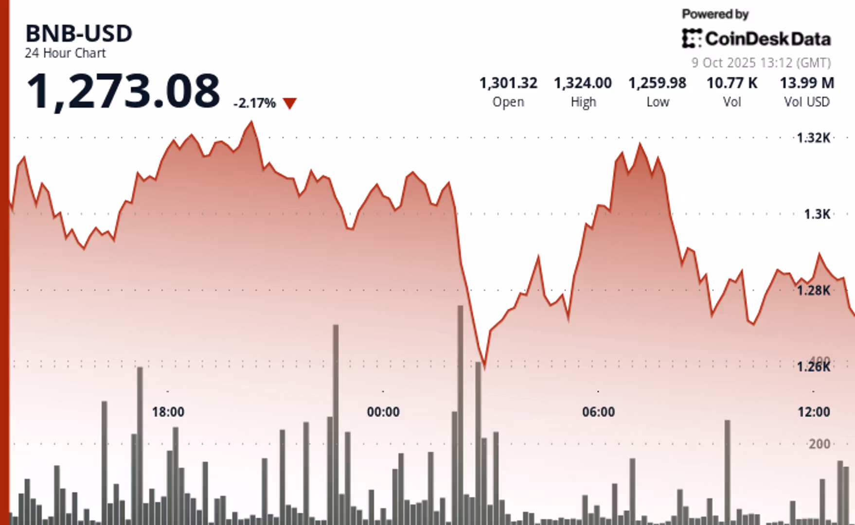 Токен BNB снизился на 2 % за последние 24 часа, упав с $1,308 до $1,255 и стабилизировавшись на уровне $1,270.