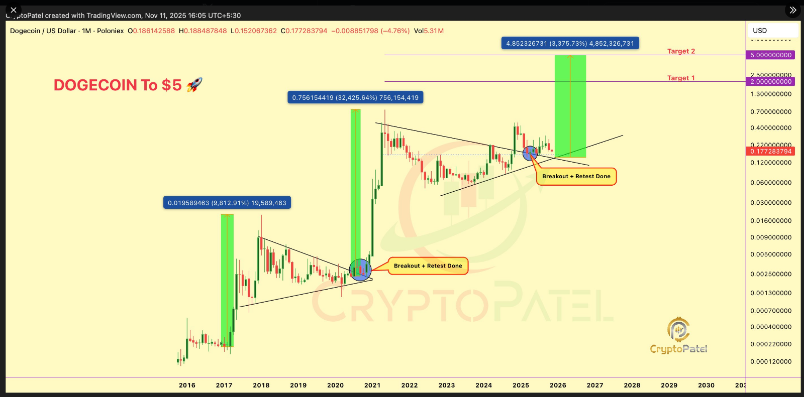 Аналитик Crypto Patel предполагает, что Dogecoin (DOGE) может достичь $2 и $5, что подразумевает потенциальный рост от 1 076% до более чем 2 800% от текущей цены около $0.17.