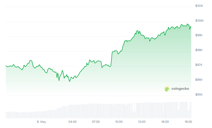 Биткойн приблизился к $100,000 7 мая, достигнув $99,200 после поста президента США Дональда Трампа о предстоящей торговой сделке с Великобританией, которая будет объявлена 8 мая. Криптовалюта выросла с $97,100 после этого объявления.