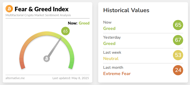 - Рыночные настроения изменились на "Жадность", индекс страха и жадности крипторынка составил 65.