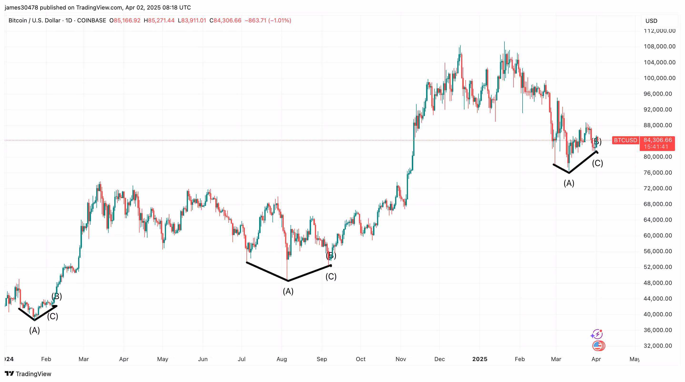 - После минимума 10 марта были зафиксированы более высокие минимумы: около $78,000 28 февраля и немного выше $81,000 31 марта, образуя треугольное дно.
