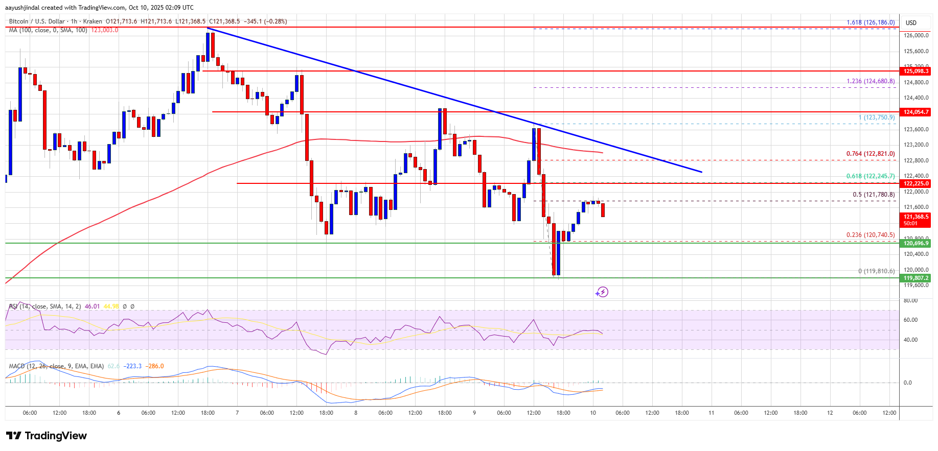 Цена Bitcoin корректируется вниз, опустившись ниже $124 000 и торгуясь ниже 100-часовой простой скользящей средней.