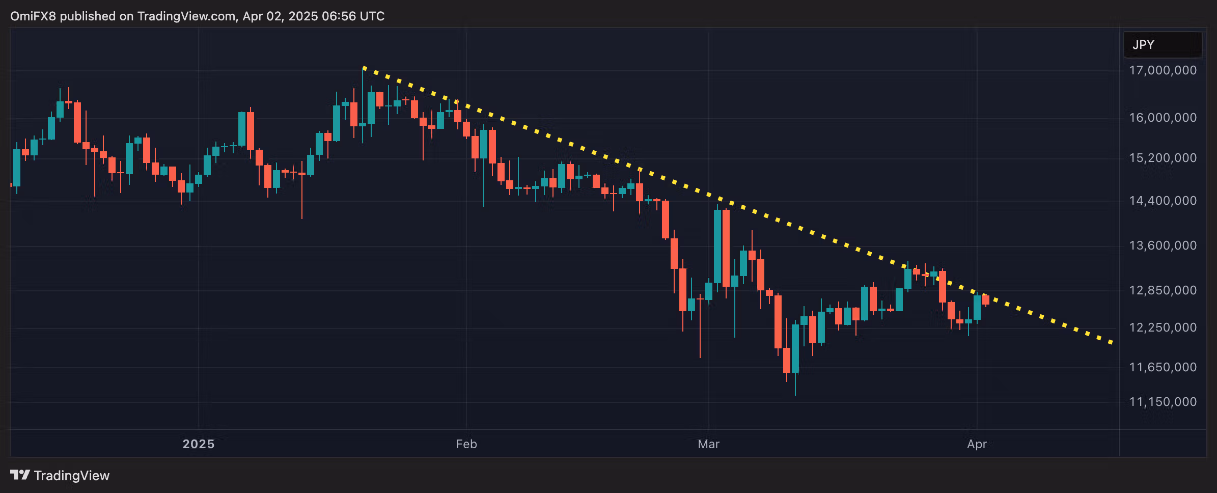 Пара Bitcoin-Japanese yen (BTC/JPY) столкнулась с сопротивлением на ключевой трендовой линии, упав на 1% на платформе bitFlyer. Goldman Sachs выделил иену как предпочтительный хедж против растущих тарифов США и рисков рецессии.
