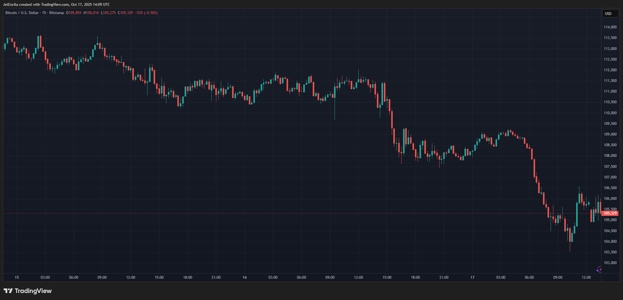 - Bitcoin упал более чем на 5 % до примерно $105 105, снизившись на 13 % от пика 6 октября.