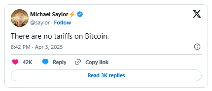 - Сейлор написал в Twitter: "На Биткойн нет тарифов".