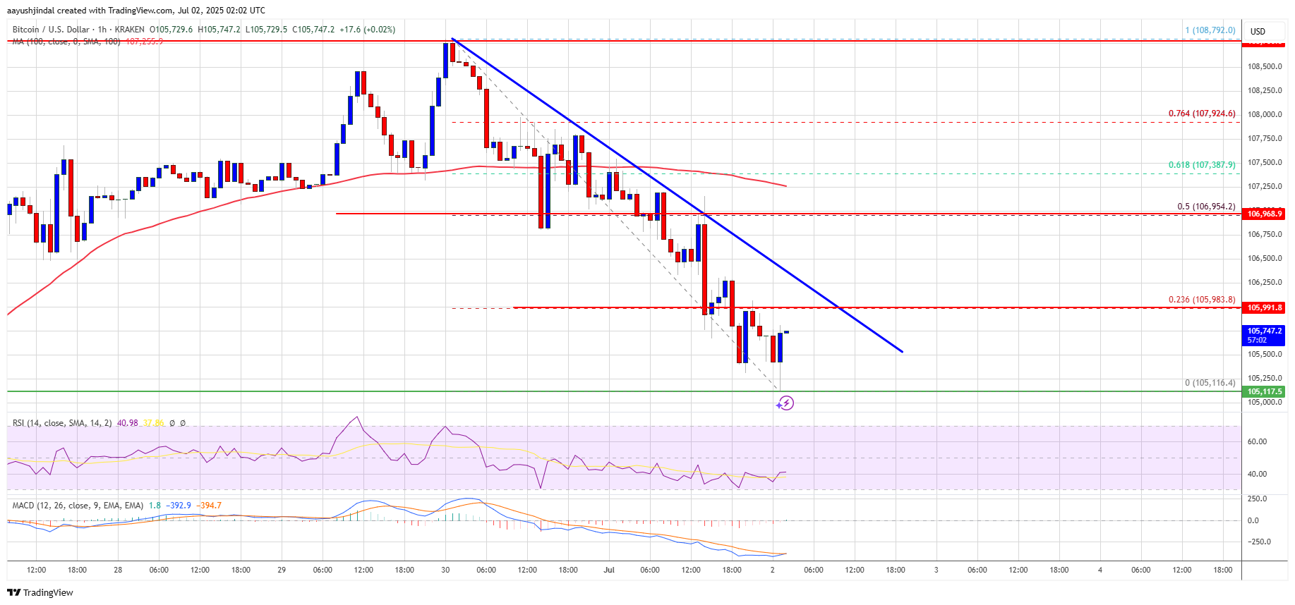 Биткойн не смог преодолеть уровень сопротивления в $108,800, упав до минимума в $105,116. В настоящее время он торгуется ниже уровня 23,6% Фибоначчи от снижения с $108,792 до $105,116.
