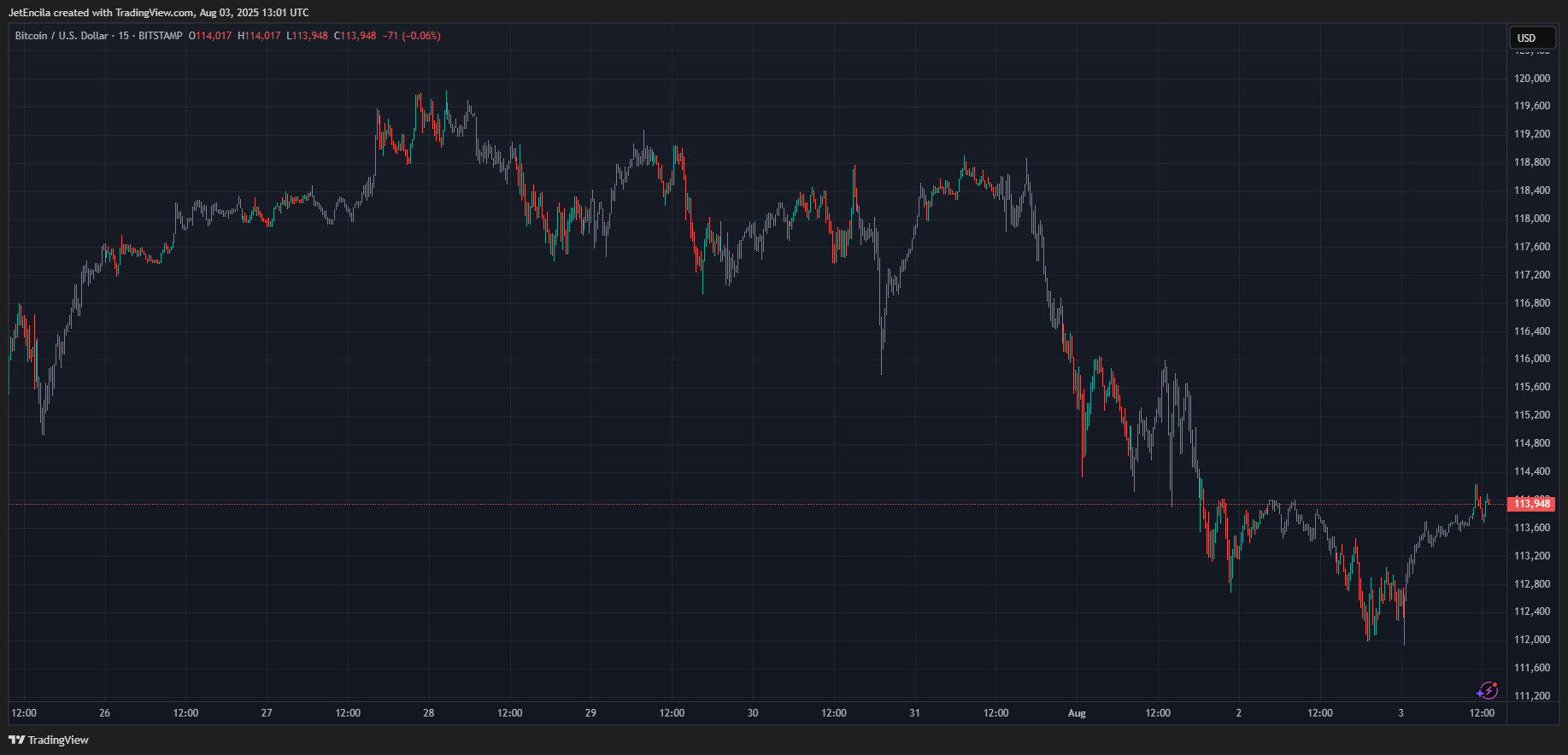 - Биткоин торговался около $114,113 после недавнего максимума в $118K.