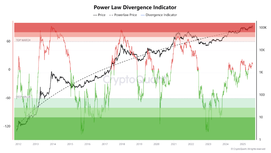 Недавнее движение цены Биткоина стабильно, в отличие от предыдущих волатильных ралли. В настоящее время он торгуется выше своей исторической траектории роста, но остаётся ниже уровней, указывающих на перегрев.