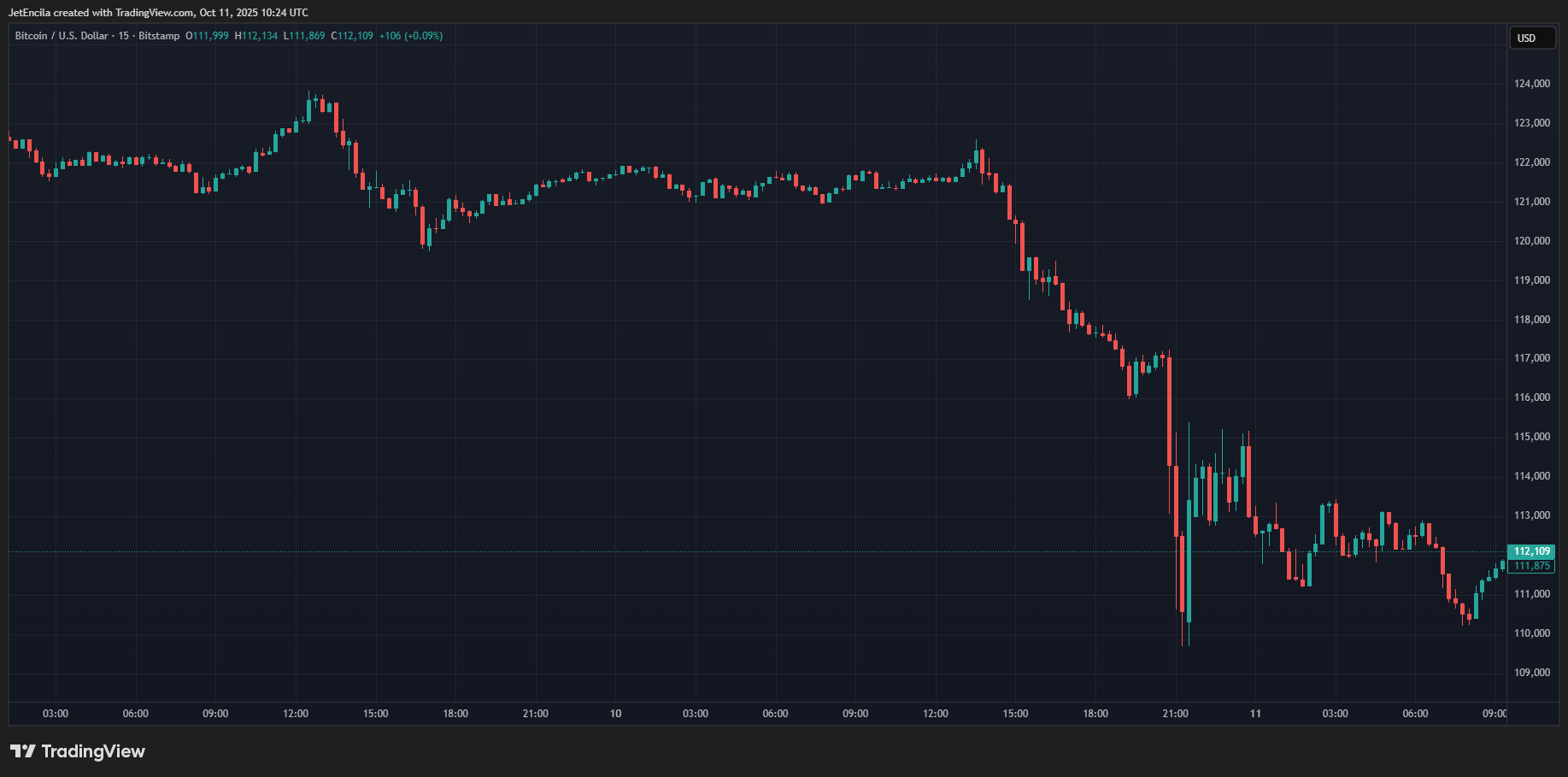 - Рынок быстро восстановился до примерно $112,100 после достижения максимумов выше $126,000 ранее на неделе.