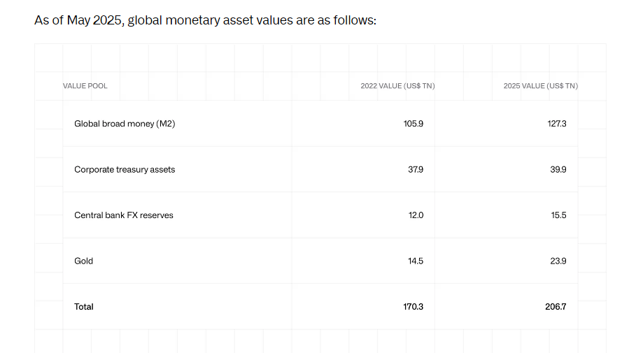 Модель общего адресного рынка (TAM) оценивает крупные финансовые пулы — наличные, депозиты, золото — и предполагает потенциальные доли для новых участников. CoinShares использует данные из авторитетных источников, таких как Всемирный совет по золоту и Trading Economics.