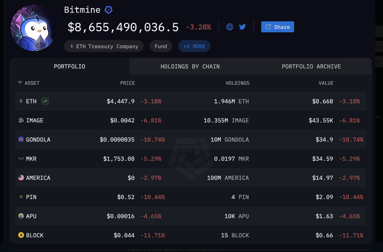 - BitMine теперь владеет примерно 1,95 миллионами ETH, стоимостью около $8,66 миллиардов.