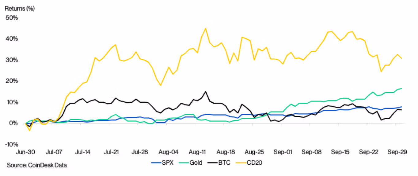 Индекс CoinDesk 20, отслеживающий высоколиквидные цифровые активы, превзошел биткоин с более чем 30% ростом в третьем квартале. Это отражает широкий рыночный интерес. Будущие катализаторы включают стандарты для общих крипто ETF и мультиактивные ETP, обещающие более глубокое вовлечение институционалов и возобновление интереса к альткоинам.