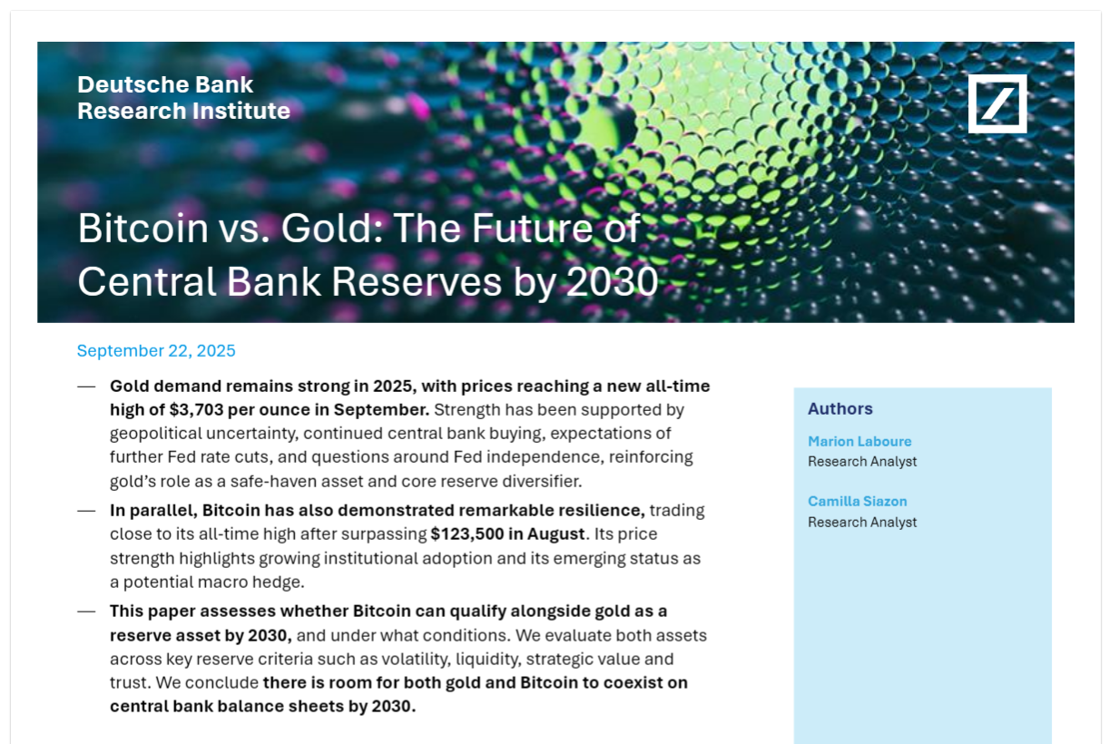Согласно исследованию Deutsche Bank, к 2030 году Bitcoin может быть включён в резервы центральных банков наряду с золотом. Основные моменты отчёта: