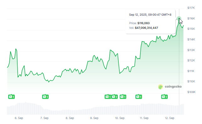 - Биткоин торгуется выше $116 000, прирост 0,25% за день и 3% за неделю.