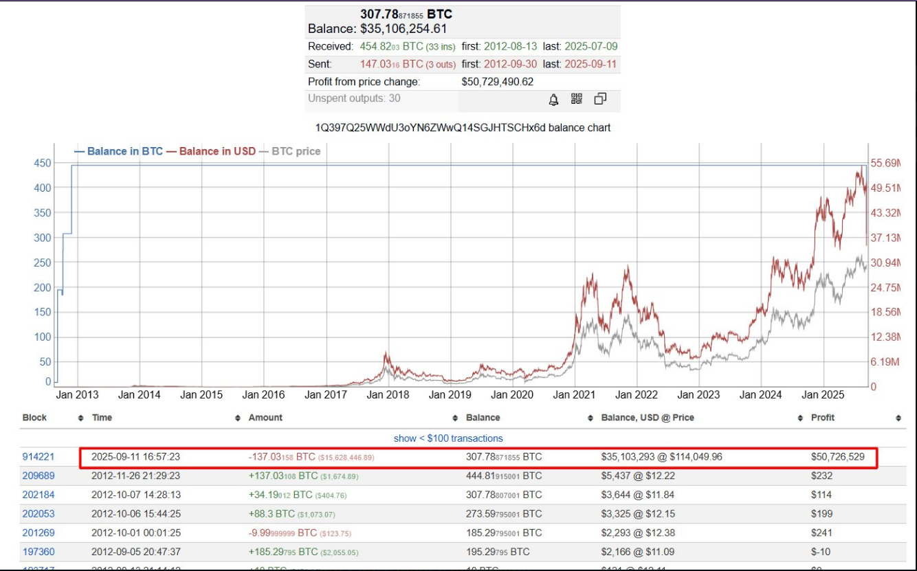 - Изначально он содержал 444 BTC, что сегодня стоит более $50 миллионов.