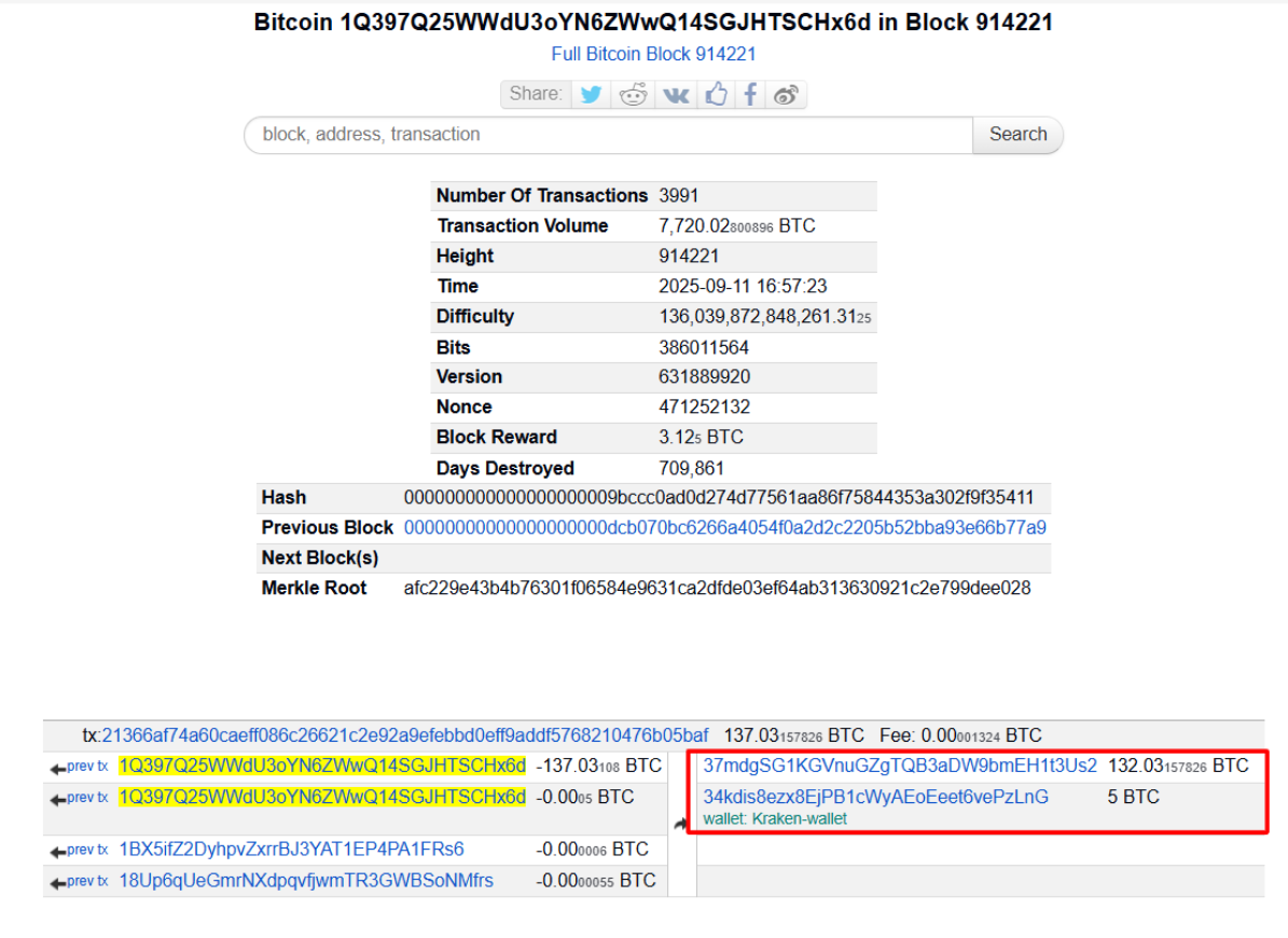 - Кошелёк отправил 5 BTC на Kraken и удерживает 308 BTC, сейчас это почти $35 миллионов.