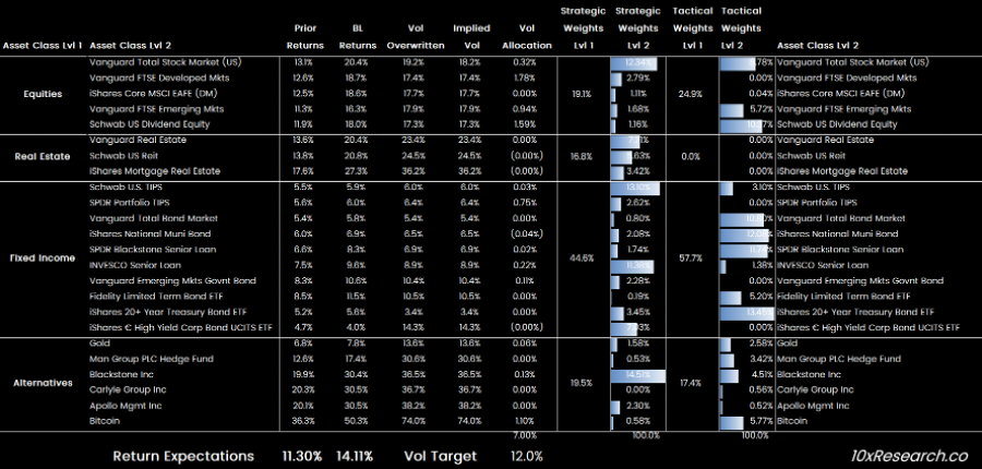 Если ожидается, что биткойн превзойдет американские акции на +30% в 2025 году, американские акции превзойдут облигации на +15%, а портфель нацелен на уровень волатильности 12%, то последуют несколько корректировок: доля акций вырастет с 19,1% до 24,9%, доля недвижимости снизится с 16,8% до 0%, доля фиксированного дохода увеличится с 44,6% до 57,7%, а альтернативы уменьшатся с 19,5% до 17,4%. В частности, доля биткойна вырастет с 0,58% до 5,77% на основе его текущей доли рынка.