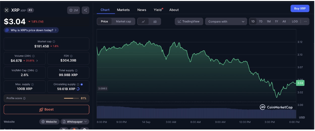 Цена Ripple's XRP осталась стабильной выше уровня поддержки в $3 14 сентября, несмотря на внутридневные потери ниже 3%...