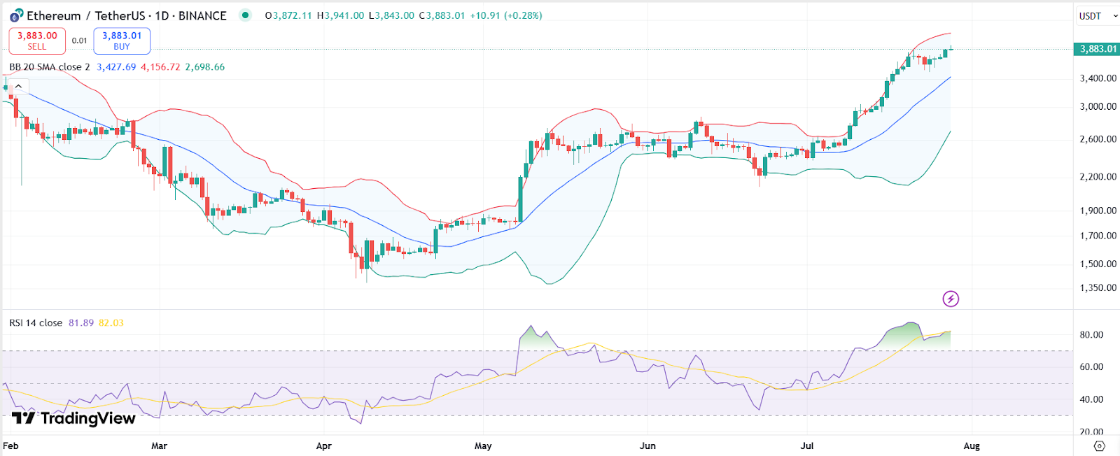 Цена Ethereum увеличилась на 4% за последние 24 часа, приближаясь к уровню в $4,000.