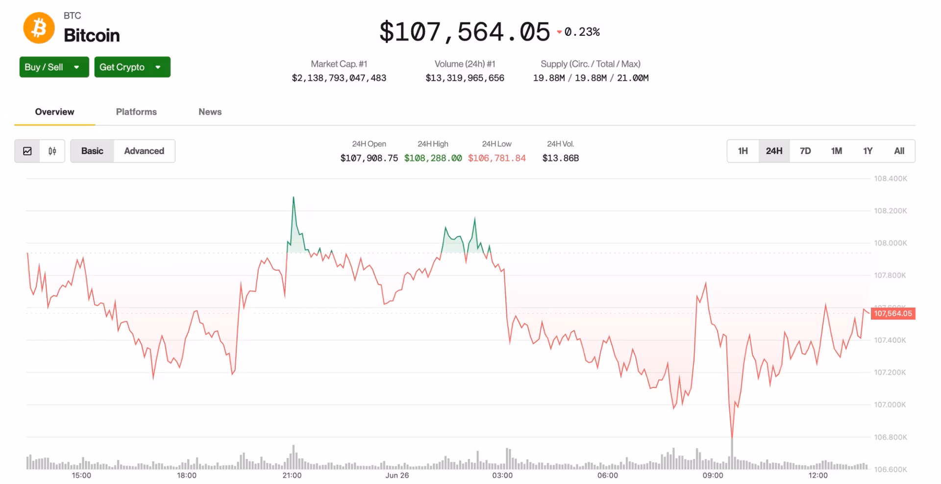 Bitcoin (BTC) торгуется по цене $107,500, снизившись на 0.2% за последние 24 часа. Индекс CoinDesk 20 упал на 0.9%.