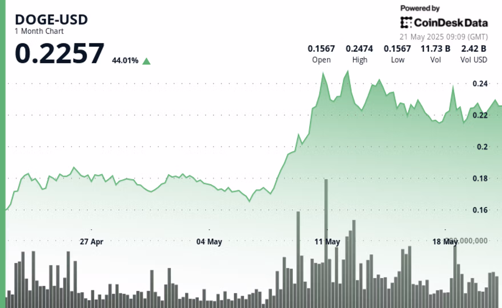 Dogecoin находится в фазе консолидации ниже уровня сопротивления $0.26, после снижения на 18% с локального максимума 10 мая.