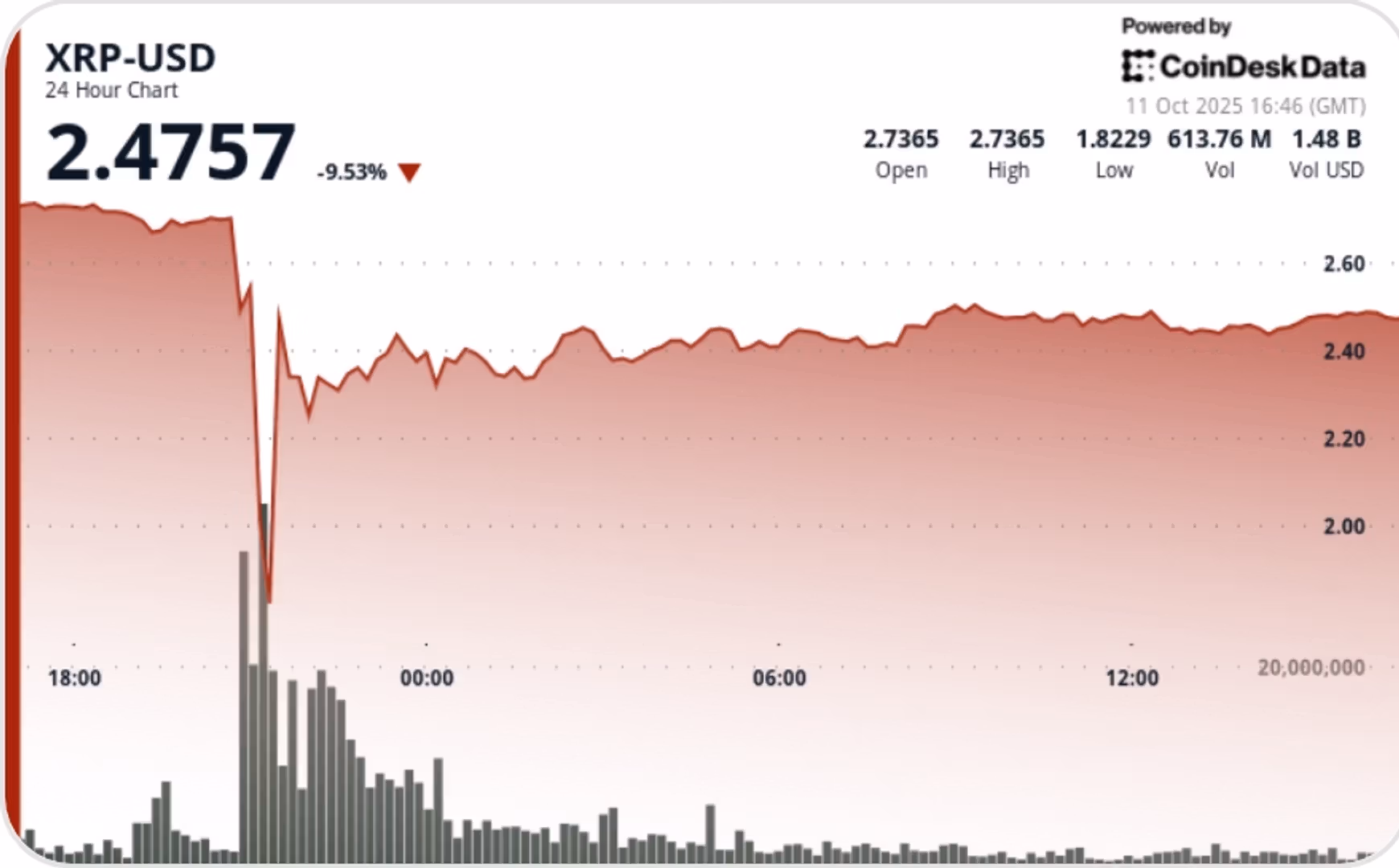 XRP упал с $2,77 до $1,64 в течение 24 часов, затем восстановился до $2,49.