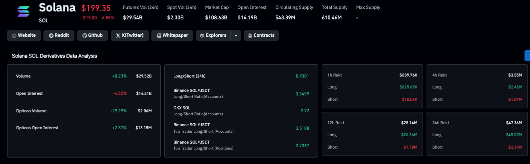 Solana упала ниже $200 из-за ликвидаций на $45M