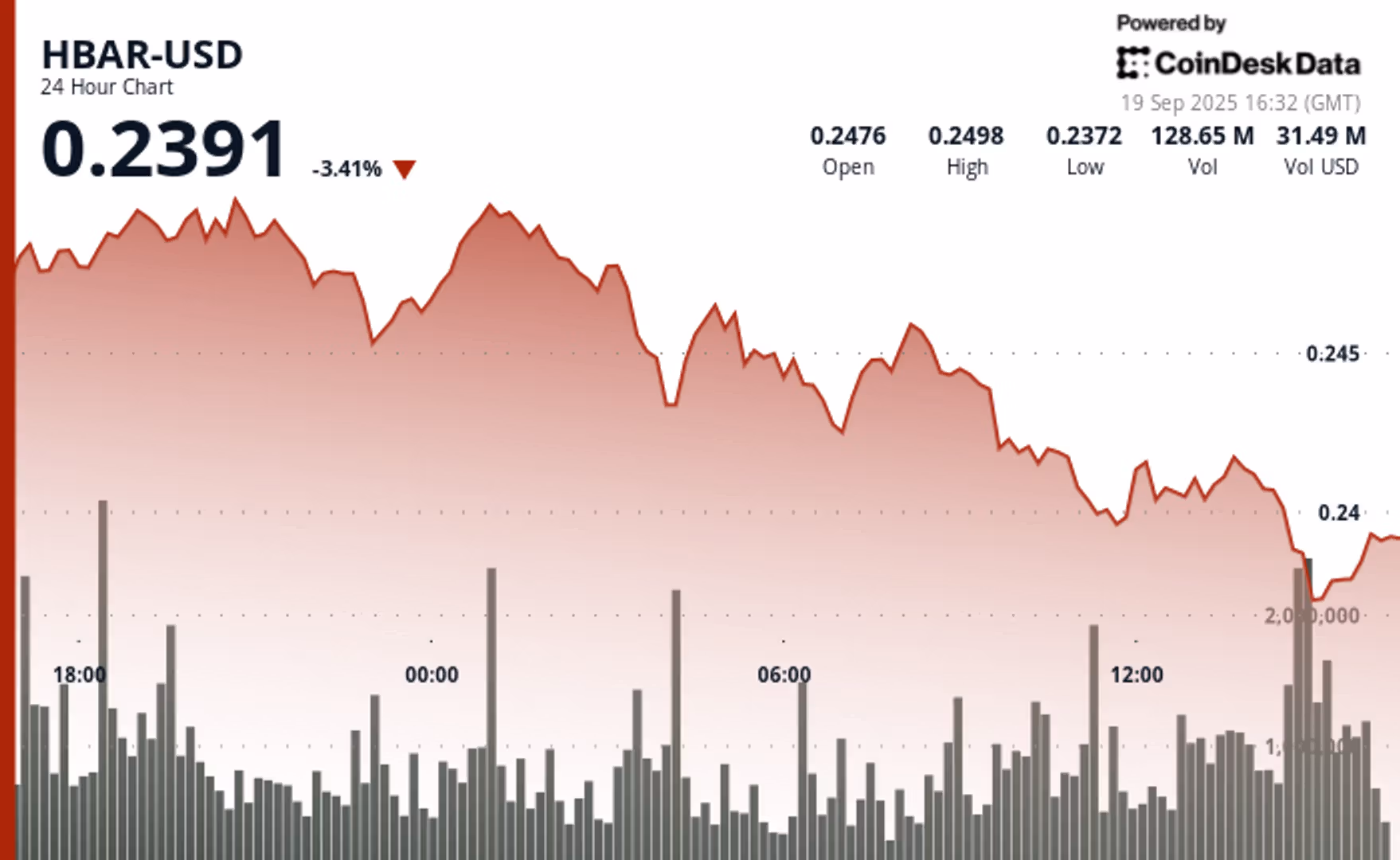 - HBAR снизился на 3,38 %, упав с $0,25 до $0,24 за последние 23 часа.