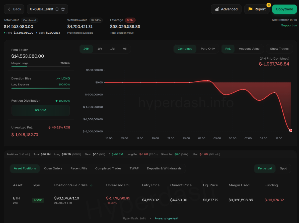 Кит открыл лонг на $100M в ETH, потерял $2M