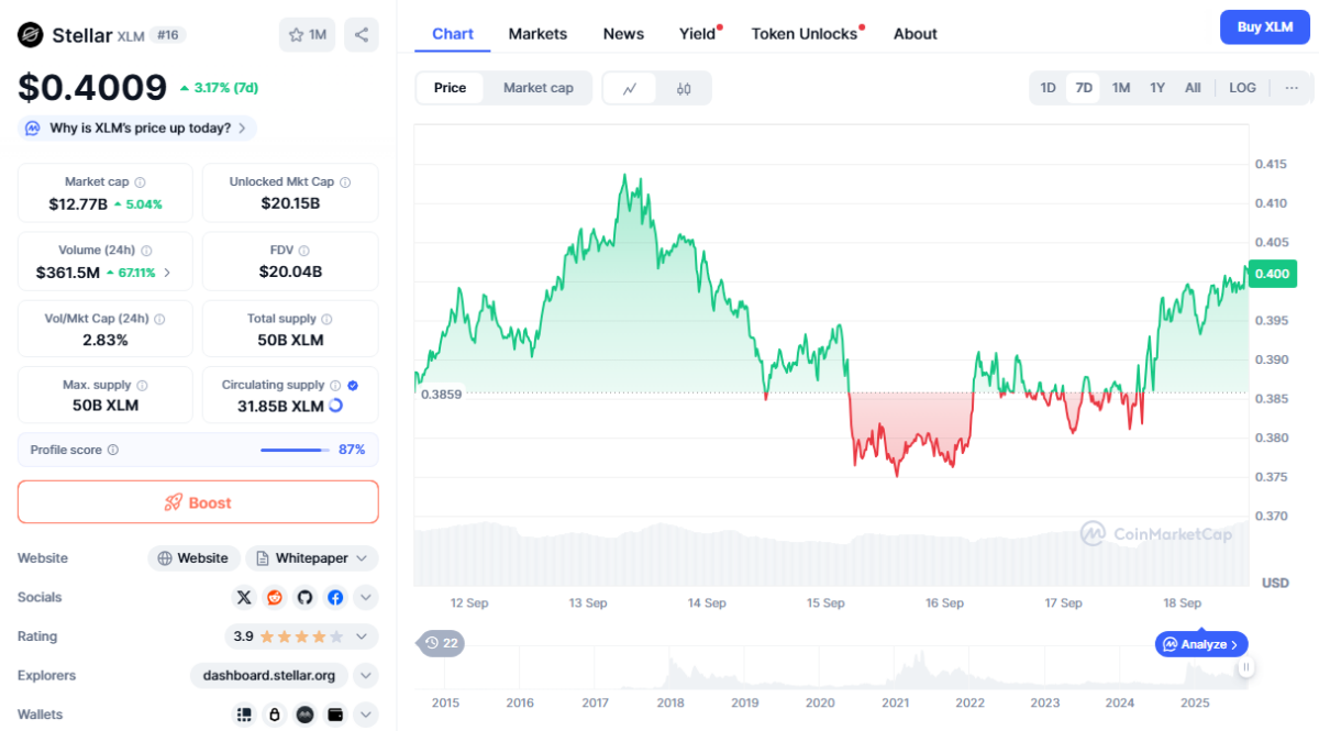 XLM от Stellar продемонстрировал устойчивость в течение 24 часов с 17 по 18 сентября, торгуясь в диапазоне $0,38–$0,40.