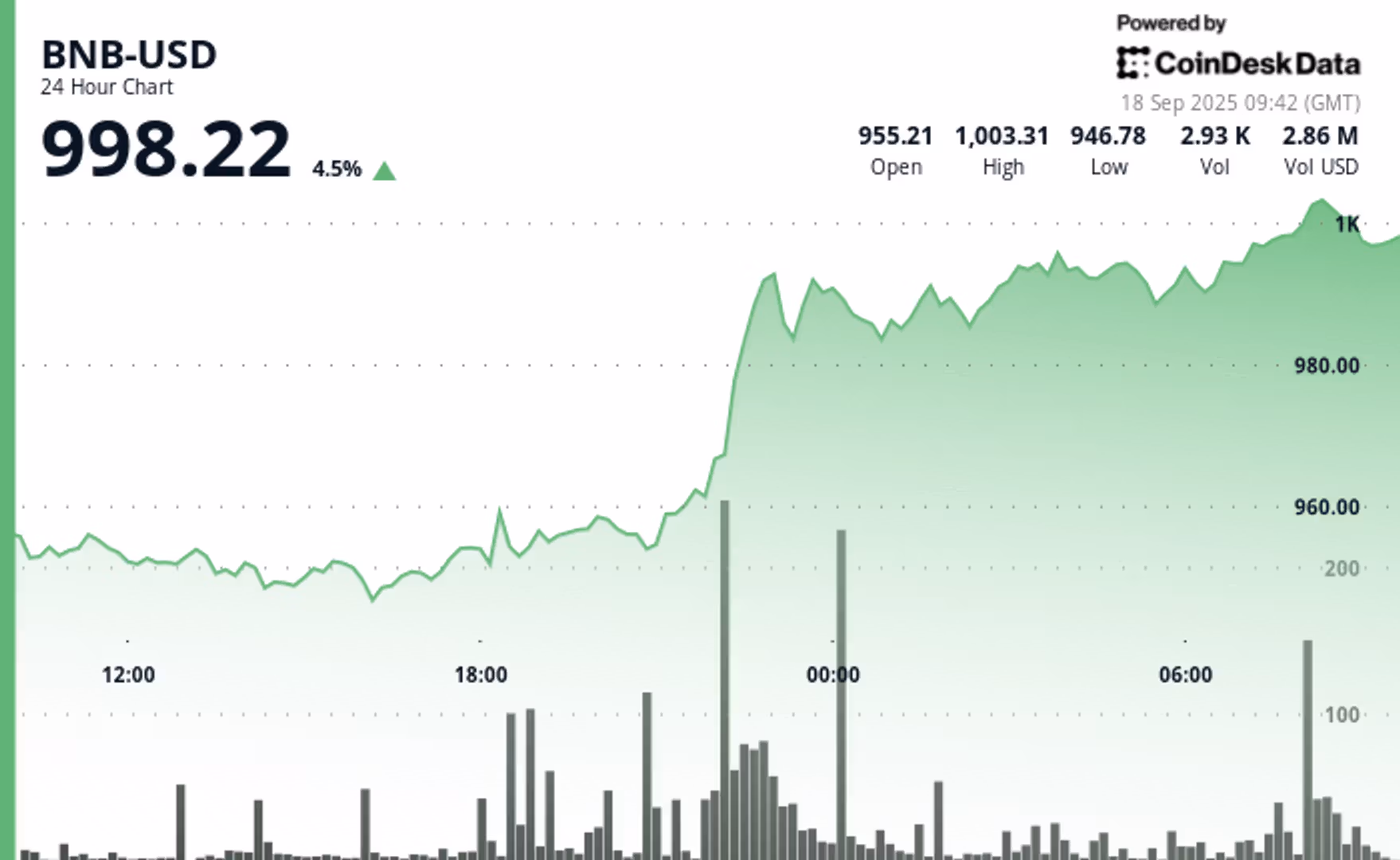 Токен BNB впервые превысил $1,000, увеличившись на 4,5 % за сутки. Рыночная капитализация приблизилась к $140 миллиардам.