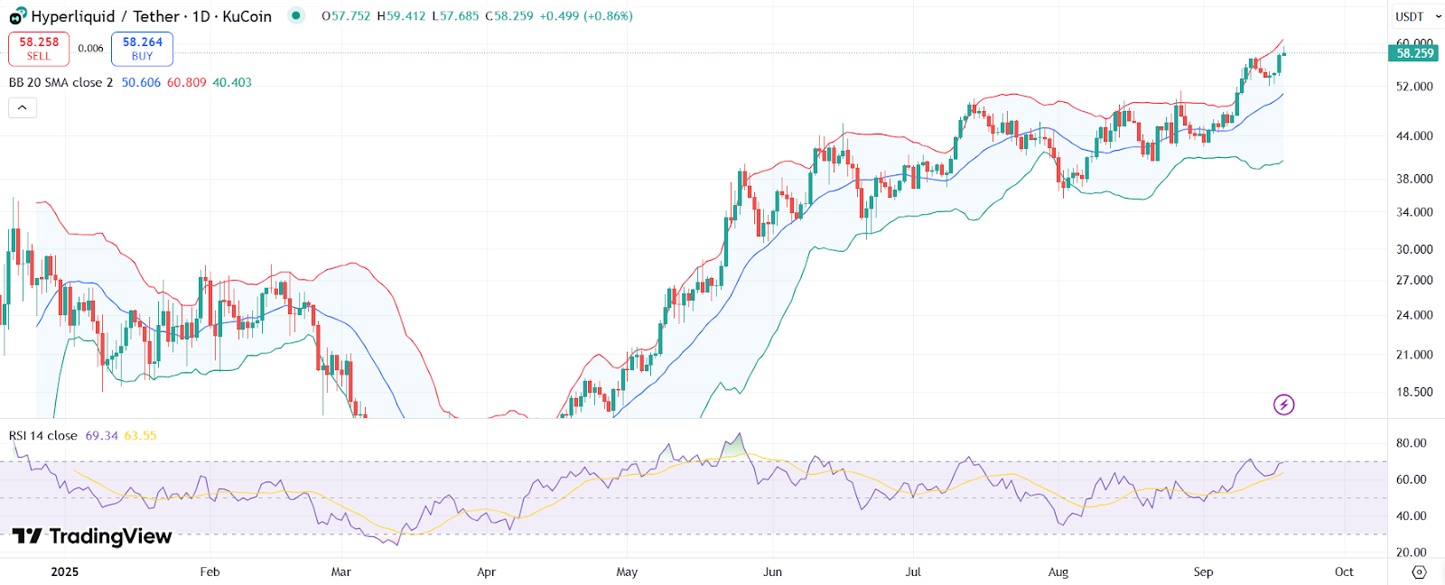 Токен децентрализованной биржи криптодеривативов Hyperliquid, HYPE, достиг исторического максимума в $59.29 18 сентября....