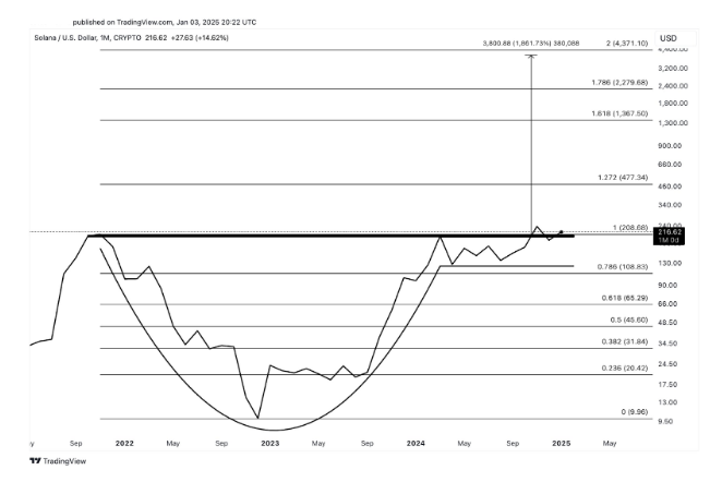 Прогноз Мартинеза основан на месячной ценовой динамике Solana, которая напоминает форму чашки с ручкой. Этот паттерн охватывает медвежий рынок 2022 года, консолидацию 2023 года и ожидаемый бычий рынок 2024 года.
