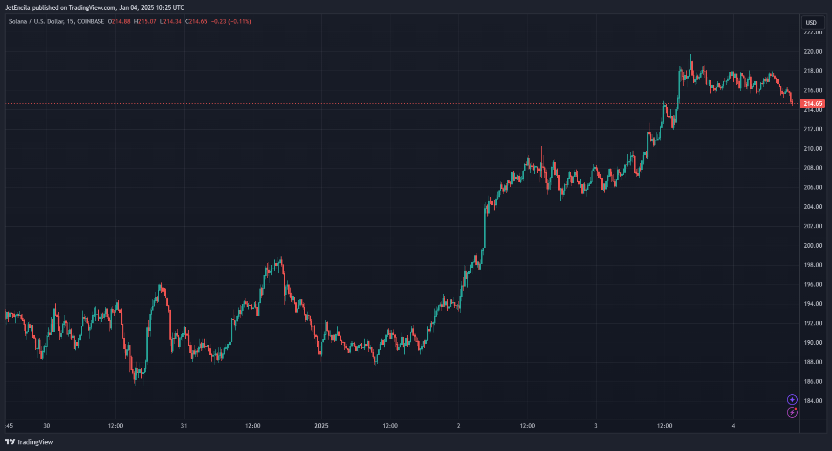 В настоящее время Solana торгуется по цене $215, что отражает прирост на 3% за последние 24 часа и увеличение на 16% за последнюю неделю. Этот рост соответствует увеличению объема торгов на 16% за последние 24 часа.