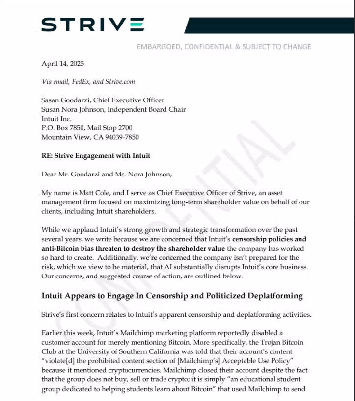 Мэтт Коул, генеральный директор Strive Asset Management, обратился к руководству Intuit с просьбой пересмотреть политику цензуры. Он считает, что такие меры угрожают стоимости акций компании. В качестве примера он привел отключение аккаунта Trojan Bitcoin Club в Mailchimp за упоминание криптовалюты, что свидетельствует о более широком антипозиционировании биткойна.