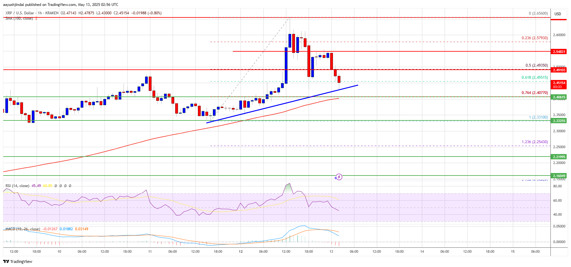 Цена XRP в настоящее время поддерживается выше $2.250, начав восходящее движение после тестирования уровня $2.420.
