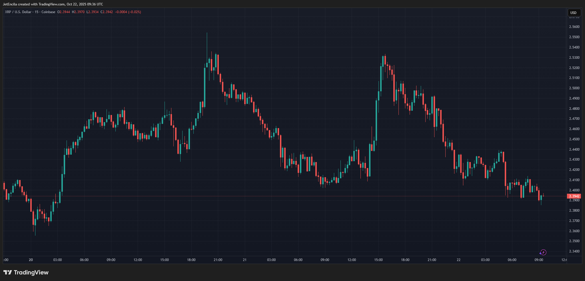 XRP на этой неделе показал колебания, снизившись с $2,43 до $2,40. Это снижение составило 1,14 % за 24 часа. При этом дневной объём торгов вырос на 6,39 %, достигнув $4,9 млрд.