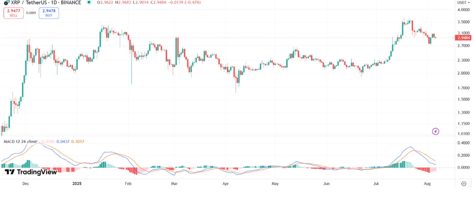 Цена XRP упала ниже ключевого уровня поддержки в $3 и составляет $2.96. Это привело к потере рыночной капитализации в $5 миллиардов и снижению на 2.5% за последние 24 часа из-за значительных продаж.